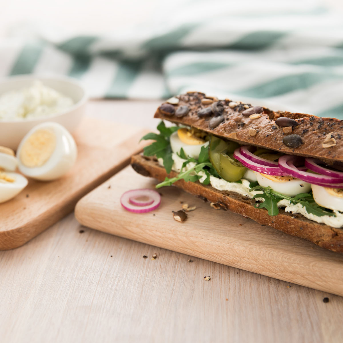 - Kend a paradicsomos krémsajtot a bagett alsó felére, majd tedd rá a saláta leveleket, paprika karikákat, a grillezett csirkemellet és az Emmentáli szeleteket.